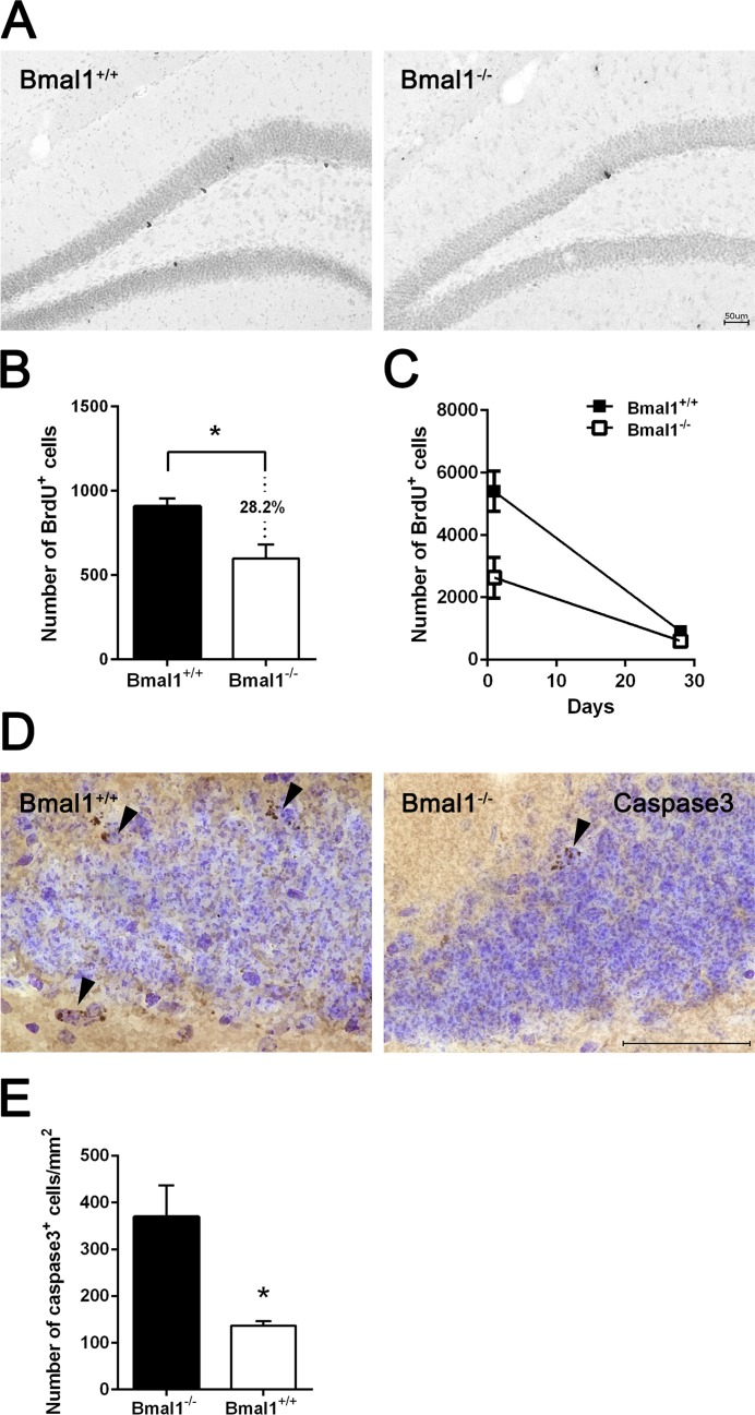 Survival of NPCs in DG was analyzed 28 days after the last BrdU administration. The number of BrdU positive cells was significantly reduced by about 28.2% in Bmal1−/− mice (647±83.9) as compared to Bmal1+/+ mice (901.2±52.97) (P=0.03) (Fig. 4A, B), consistently with a reduced total number of NPCs in adult Bmal1−/− mice. Linear regression revealed a steeper slope in Bmal1+/+ mice as compared to Bmal1−/− mice (P=0.028) (Fig. 4C), indicating a higher survival rate in Bmal1−/− mice. Consistently, the number of caspase3+ cells/mm2 in DG was significantly decreased in Bmal1−/− (136.5±5.1) as compared to Bmal1+/+ mice (369.3 ± 33.60) (P=0.028) (Fig. 4D, E), indicating decreased cell death in DG of Bmal1−/− mice.