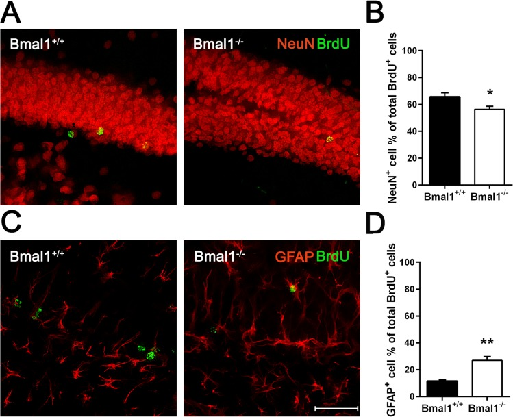 Differentiation of NPCs was assessed 28 days after the last BrdU administration. Neuronal differentiation was analyzed by calculating the percentage of cells co-expressing BrdU and neuronal marker NeuN. The percentage of BrdU/NeuN positive cells was significantly lower in Bmal1−/− mice (56.31± 2.24%) as compared to Bmal1+/+ mice (65.48± 3.11%) (P=0.033) (Fig. 5A, B). In contrast, the percentage of cells co-expressing BrdU and the astrocyte marker GFAP was significantly higher in Bmal1−/− mice (26.96± 2.81%) as compared to Bmal1+/+ mice (11.45±1.128%) (P=0.008) (Fig. 5C, D). Based on these findings, we conclude that the fate decision of neuronal progenitors was shifted towards the astroglial lineage at the expense of the neuronal lineage in Bmal1−/− mice.
