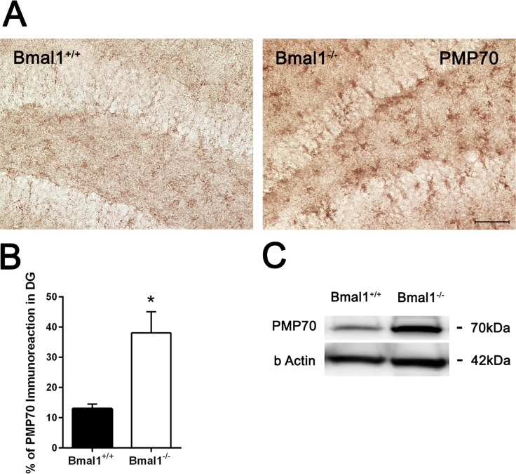 As peroxisomes play an important role in ROS homeostasis and cellular aging, expression of peroxisome-related protein PMP70 was analyzed. Immunohistochemistry and immunoblotting revealed higher PMP70 levels in the DG of Bmal1−/− mice as compared to Bmal1+/+ mice (P=0.024) (Fig. 6).