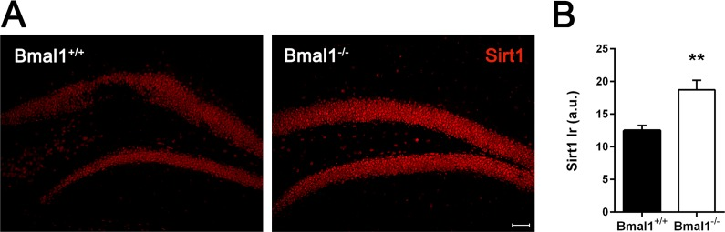 Considering associated pathways responsible for disturbed proliferation and differentiation of neural progenitors, we assessed the possible involvement of Sirt1. This NAD+-dependent histone deacetylase (HDAC) has been shown to play a crucial role in regulating redox-dependent fate of neural progenitors [33] and to interact with circadian promoters in a cyclic manner [42]. Indeed, the intensity of Sirt1-immunoreaction in the DG of Bmal1−/− mice was significantly higher as compared to Bmal1+/+ mice (P=0.004) (Fig. 7).