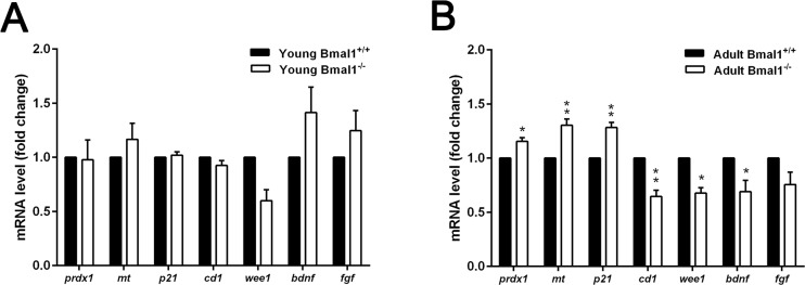 Further analysis of genes induced by oxidative stress (prdx1, mt), cell cycle genes (p21Waf1/CIP1, cd1, wee1) in addition to genes that encode for neurotrophic factors (bdnf, fgf) was performed. We compared the expression of these genes between Bmal1+/+ and Bmal1−/− mice of two different ages: young mice (6 weeks old) and adult mice (12 weeks old). In adult mice, ROS sensitive genes prdx1 and mt were significantly up-regulated in Bmal1−/− (P=0.0142, P=0.00612; respectively) as compared to Bmal1+/+ mice, consistently with high oxidative stress in the brain of Bmal1−/− mice [22]. In addition, in Bmal1−/− mice, expression level of p21Waf1/CIP1 was significantly higher, whereas expression levels of cd1 and wee1 (P=0.003) were significantly lower as compared to Bmal1+/+ mice. Expression of bdnf was down regulated in Bmal1−/− mice (P=0.04). In contrast to this, there were no significant differences in expression levels between both genotypes in young mice. Expression of fgf was not different between the two genotypes in both ages (Fig. 8).