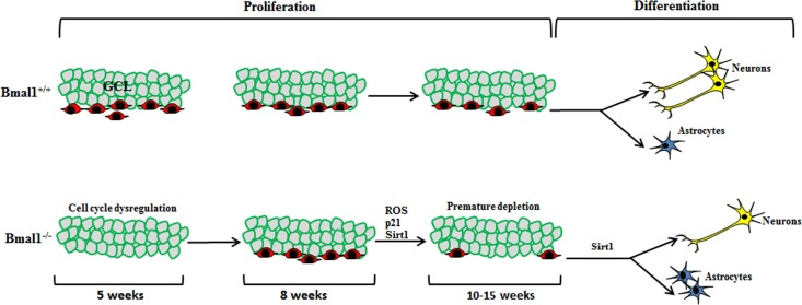 An earlier study [17] in young (5 weeks old) Bmal1−/− mice showed enhanced proliferation of hippocampal NPCs. Using mathematical models, they postulated that dysregulated clock-driven expression of a cell cycle inhibitor targets is attributed to enhanced entry and diminished cell cycle exit in Bmal1−/− progenitors. In contrast to 5 weeks old mice, no difference in proliferating capacity of hippocampal NPCs was found in 8 weeks old Bmal1−/− mice [15], indicating that the promoting effect of Bmal1-deficiency on mitotic activity is transient and age-dependent. In our study, we used adult mice (10-15 weeks old); this age is of particular interest, as it is before the onset of systemic growth retardation as a hallmark of accelerated aging in 16-18 weeks old Bmal1−/− mice [23], and before the development of neuropathologies in 24 weeks old Bmal1−/− mice [25]. We observed a significant decrease in the pool of hippocampal NPCs in Bmal1−/− as compared to Bmal1+/+ littermates. This indicates that, at the age between 5 and 10 weeks, there was a dramatic down-regulation in proliferation activity of NPCs presumably due to accelerated aging/senescence in Bmal1−/− mice (Fig. 9).