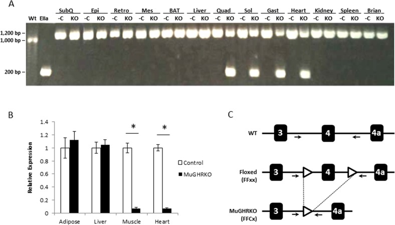 Muscle-specific disruption of the GHR gene was verified by PCR in WAT (subcutaneous, epididymal, retroperitoneal, and mesenteric depots), BAT, liver, skeletal muscles (quadriceps, soleus, gastrocnemius), heart, kidney, spleen, and brain tissue collected from LiGHRKO and floxed control mice. DNA isolated from global GHR gene disrupted (EIIa) mice and floxed littermate controls were used as positive and negative controls, respectively. PCR was performed as previously described [22, 26]. Relative expression of GHR mRNA was determined by real time RT-PCR as previously described [22, 26].