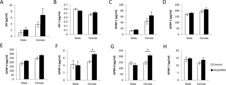 To test the effects of muscle-specific disruption of the GHR on the GH/IGF-1 axis, serum levels of GH, IGF-1 and IGPBP-1, -2, -3, -5, -6 and -7 were measured at 6 months of age (n=9-10, per group, per sex). Serum GH and IGF-1 levels were unchanged in MuGHRKO compared to controls for both sexes (Fig 2A & B). No significant changes were observed for IGFBP-1, -2, -3, or -7 (Fig 2C-E, H) in either sex. Serum levels of IGFBP-5 (Fig 2F) and IGFBP-6 (Fig 2G) were significantly increased in female MuGHRKO mice but not in males. No significant changes were seen in IGF-1 mRNA levels in MuGHRKO mice compared to controls in liver, white adipose tissue, brown adipose tissue, heart, or skeletal muscle (data not shown). Thus, removal of direct GH action on muscle has no measurable effect on IGF-1 with regards to circulating IGF-1 or IGF-1 mRNA in various tissues, including muscle and heart; however, IGFBP-5 and -6 are significantly increased in females.