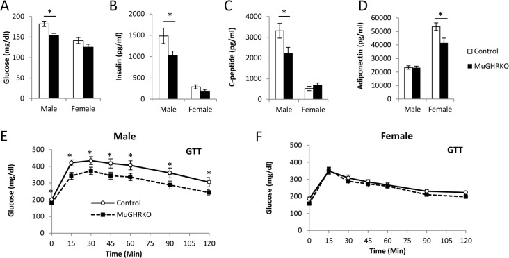 To determine the effects of muscle-specific GHR disruption on glucose homeostasis, we measured fasting blood glucose, plasma insulin, c-peptide, adiponectin and glucose tolerance at 6 months of age (n=15-17, per group per sex). Fasting blood glucose (Fig 3A) was significantly decreased in male MuGHRKO mice compared to controls; however, fasting blood glucose levels in female MuGHRKO mice did not differ from controls. Similarly, fasting levels of insulin (Fig 3B) and c-peptide (Fig 3C) were significantly decreased in males, while insulin and c-peptide levels in female MuGHRKO were unchanged. Circulating adiponectin levels were significantly decreased in females, but unchanged in male MuGHRKO mice (Fig 3D). Glucose tolerance was significantly improved in MuGHRKO males (Fig 3E) but not in females (Fig 3F). Thus, the hyperglycemic tendency in glucose homeostasis in males is improved when GH action is disrupted specifically in muscle.