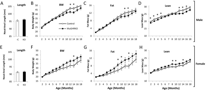 In order to assess the effects of muscle-specific disruption of GH action on body size and composition, body lengths were determined at 6 months of age (n=14-16, per group per sex), and body weight and body composition were determined over time from 2 to 18 months of age (n=17-22, per group per sex). Body lengths were unchanged in MuGHRKO mice compared to controls for both sexes (Fig 4). Body weight was altered in opposite directions in male vs female MuGHRKO mice compared to same sex controls. Male MuGHRKO mice had decreased body weight reaching statistical significance at 12 and 14 months of age. In contrast, female MuGHRKO mice had increased body weight at 14 months of age. Similarly fat mass was decreased at 12 and 14 months in male MuGHRKO mice, but was increased in females at 8, 10, and 14 months. Lean mass was also altered sex-specifically with male MuGHRKO mice displaying decreased lean mass that reached statistical significance at 2-5 months of age and again at 14-16 months of age, while female MuGHRKO mice had increased lean mass that was statistically significant at 8, 10, and 14 months of age. Thus, direct GH action on muscle has mild but opposite effects on body weight depending on sex.