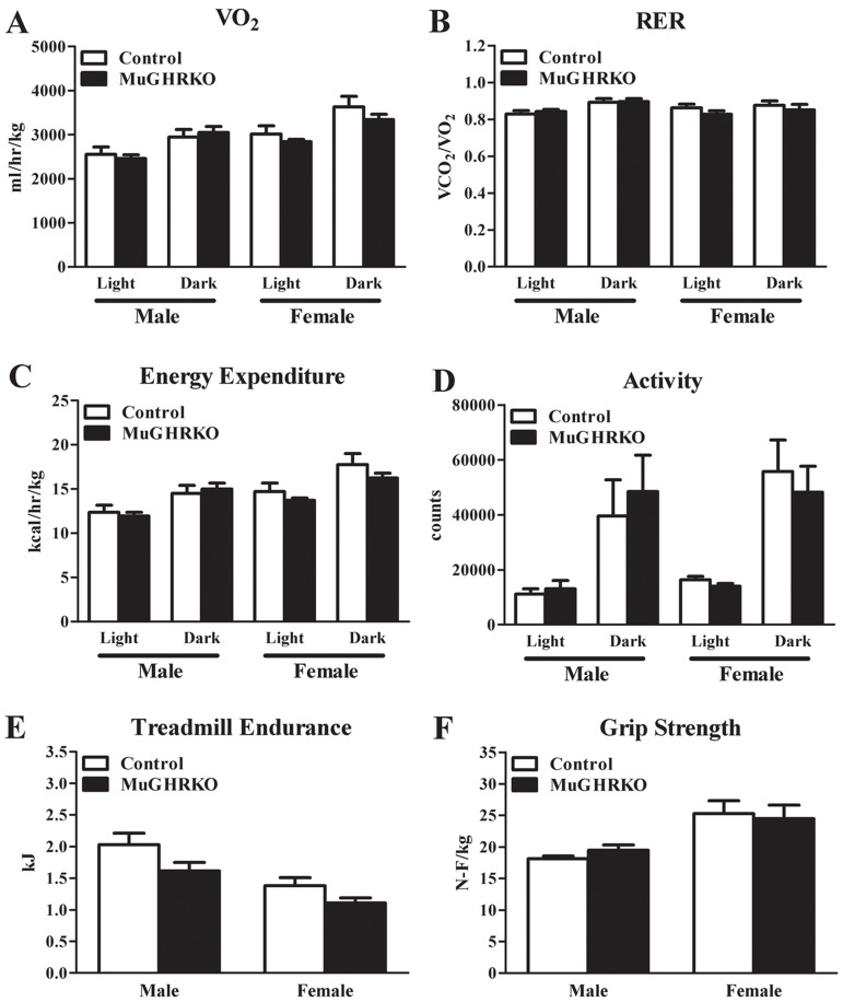 To determine the effects of muscle-specific GHR disruption on energy expenditure as well as musculoskeletal frailty in males and females, we evaluated indirect calorimetry measures, grip strength, and treadmill endurance in aged (2 year old; n=6-8, per group per sex) mice. Day and night values for VO2 normalized to lean body mass did not differ between MuGHRKO and controls (Figure 5A). Similarly, MuGHRKO mice of both sexes showed no change in respiratory exchange ratio (Figure 5B), no change in energy expenditure normalized to lean body mass (Figure 5C), and no change in activity (Figure 5D) compared to controls. Treadmill endurance and forearm grip strength were also similar in MuGHRKO mice compared to controls of both sexes (Figure 5E). Other measures, such as food intake adjusted for body weight, did not differ between MuGHRKO and controls in either sex (data not shown). Thus, direct GH action on muscle has no substantial effect on metabolism or musculoskeletal frailty.