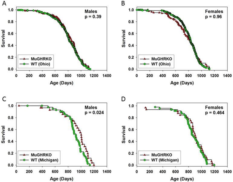 Evaluation of lifespan at Ohio University and the University of Michigan in male and female MuGHRKO mice