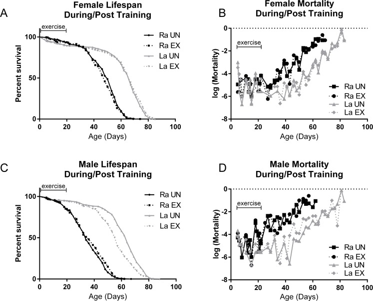 La flies are a product of selective breeding for longevity and are longer-lived than the parental Ra lines on standard laboratory diets [40]–[42]. We subjected La and Ra flies to three weeks of endurance exercise, using a ramped daily protocol [24]. Survival and age-specific mortality were measured during training and continued to be measured for the duration of the lifespan following the training period. Ra longevity was not significantly affected by three weeks of exercise training, when compared to control siblings that were placed on the machine for the same time, but restrained from exercising by a foam stopper pushed down into the vial. La longevity was not further extended by three weeks of exercise training, and La flies lived longer than Ra whether exercised or not (Figure 1A, B). In male flies only, La flies trended toward a slightly lower longevity following training, although this effect is small in comparison to the longevity difference between La and Ra males (Figure 1C).