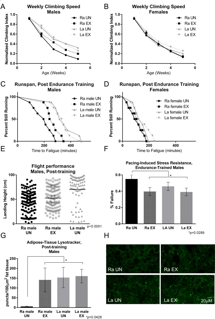 Untrained three-week old La flies have significantly higher flight index than age-matched, untrained Ra flies (Figure 2E). Three-week old male Ra flies improve their score on a flight index significantly following exercise training, indicating that running induces a systemic response that improves other functional assays as well (Figure 2E). This result is consistent with a genuine endurance training response, not simply a behavioral improvement in negative geotaxis.