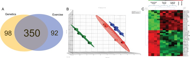 448 genes had altered expression following selective breeding from Ra to the La line (Supplementary Table S1). 442 genes had altered expression following exercise training in Ra flies in comparison to isogenic sibs (Supplementary Table S2). In order to highlight genes that may be involved in the effects of training on healthspan, we looked for the intersection of genes whose transcription was altered similarly by both selective breeding for longevity and by exercise training. 350 genes, or 65% of genes with transcription altered by breeding alone, were altered by both interventions in the same direction (Figure 3A). Orthogonal linear transformations of the input data were performed in order to assess portions of the variability associated with each principal component. The result of this Principal Component Analysis was consistent with the idea that selective breeding and exercise produce a similar pattern of variability in gene expression, represented graphically by the colored clouds in Figure 3B. Members of four KEGG pathways were significantly upregulated by both interventions, including Xenobiotic/Drug metabolism, Glutathione Metabolism and Folate biosynthesis (Table 1, Figure 3C). Members of four KEGG pathways were significantly downregulated by both interventions, including several aspects of carbohydrate metabolism (Table 1, Figure 3C).