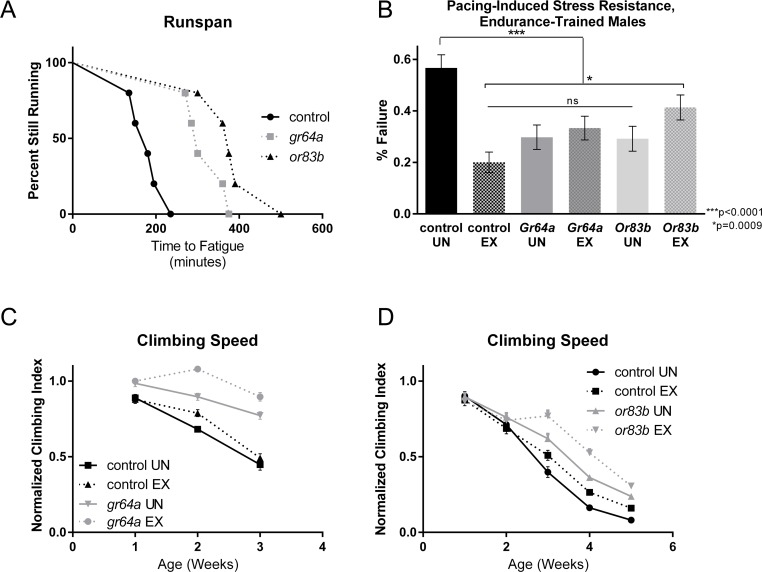 Because we find that genes involved in carbohydrate metabolism are downregulated by exercise, and because several gustatory receptors showed altered expression in both interventions, we wondered whether reduction in sugar tasting might potentiate exercise capacity. Flies mutant for Gr64a, a receptor for sweet taste involved in sensing of carbohydrate moieties [50], [51], showed improvement to runspan in one-week old flies (Figure 4A), to cardiac stress tolerance in three-week old flies (Figure 4B), and to climbing index across five weeks of age (Figure 4C). This result is also consistent with a link between nutrient sensing and exercise behavior.