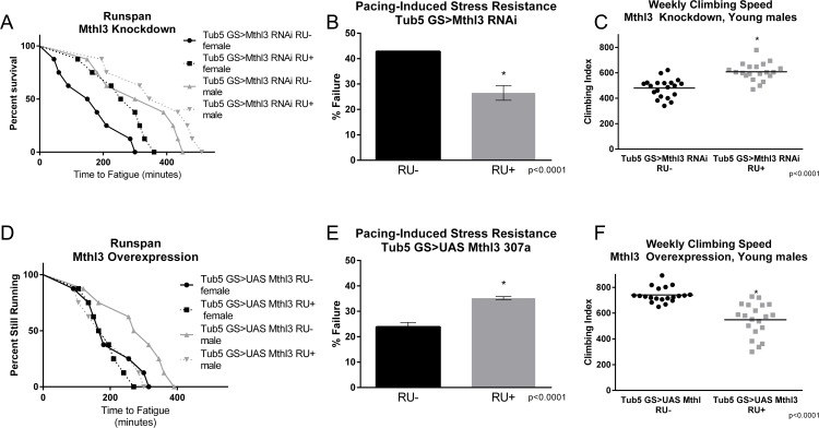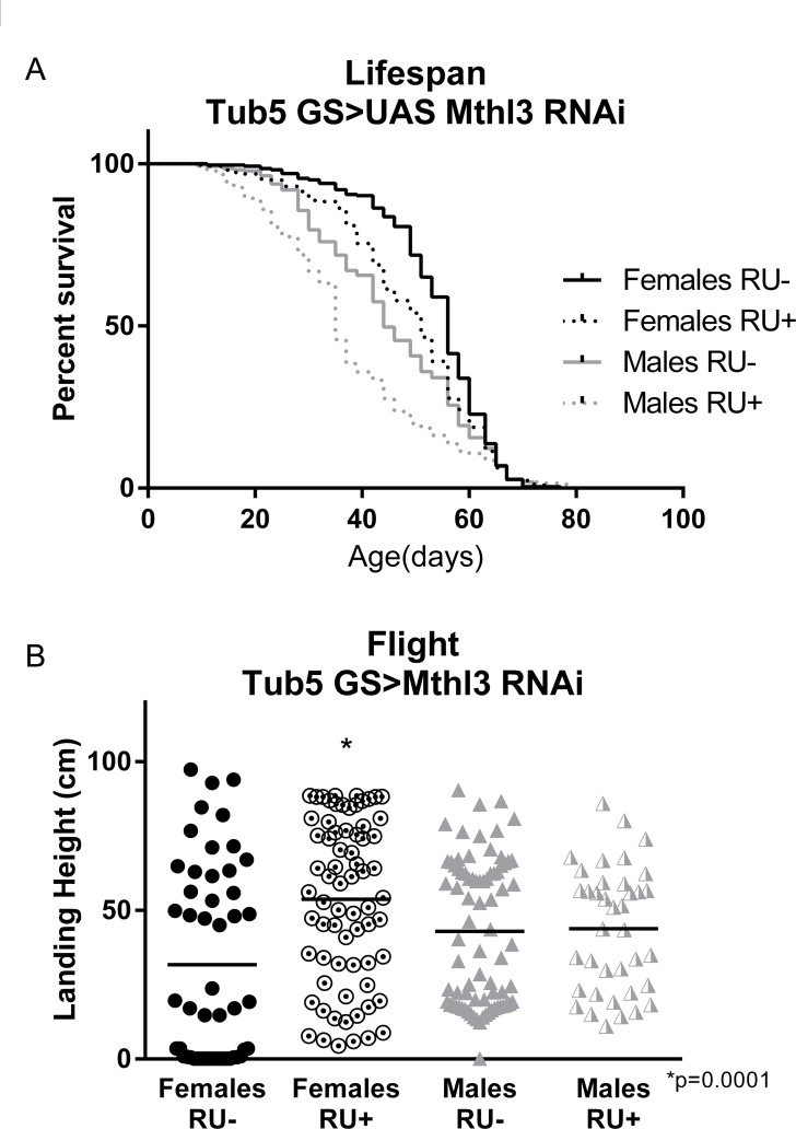 Knockdown of either mthl-9 or mthl-11 by ubiquitous expression of an RNAi construct did not improve climbing index or runspan (data not shown). However, ubiquitous knockdown of mthl-3 alone in adult flies with an RU-inducible tub5-Gal4 significantly improved runspan (Figure 5A), cardiac stress resistance (Figure 5B) and climbing index (Figure 5C) compared to RU- controls, despite only inducing a partial knockdown (Supplementary Figure S1I). Conversely, ubiquitous overexpression in adult flies (tub5-Gal4 >UAS-mthl-3) was sufficient to reduce runspan (Figure 5D), cardiac stress resistance (Figure 5E) and climbing index (Figure 5F) compared to RU- controls. By contrast, overexpression of two different UAS-mthl-3 lines with tub5-Gal4 had no significant effect on longevity (Supplementary Figure S2A, C) or flight performance (Supplementary Figure S2B, D). However, RNAi against mthl-3 somewhat reduced longevity (Figure 6A), while extending three-week old flight performance in females only (Figure 6B).