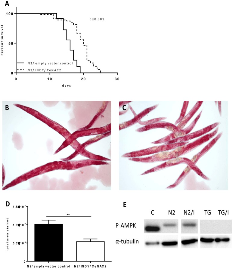 In order to test whether or not reduction of Indy/CeNAC2 in C.elegans also shares characteristics of caloric restriction, whole body fat stores were analyzed by phase contrast microscopy using the azo compound Oil Red O to stain triglycerides. The intensity (area by pixel) of Oil Red O staining of worms fed on bacteria harboring Indy/CeNAC2-specific siRNA was ~ 50% lower compared to control worms that were fed on bacteria harboring empty vector L4400 (Indy/CeNAC2-specific siRNA: 5.4e+006 ± 76988, control L4400: 1.016e+007 ± 1.127e+006, p = 0.006 Wilcoxon test) (Fig. 1B-D).