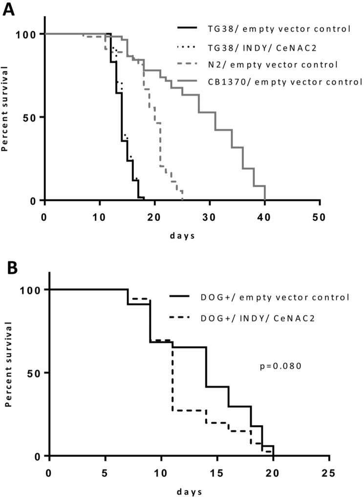 Reduced expression of the Indy (Acronym for ‘I am Not Dead, Yet’) gene in Drosophila melanogaster promotes longevity in most studies [1–5]. The underlying mechanisms recapitulate multiple characteristics of caloric restriction, i.e. reduced in body fat, insulin like proteins [4], and increased mitochondrial biogenesis [1, 6], along with the activation of FOXO and the co-transcriptional regulator PGC-1α [1, 2, 4, 7]. Interestingly, food intake in the long lived, Indy mutant flies is not reduced. Knocking down the Indy homolog CeNAC2 in C. elegans also promotes a moderate increase in lifespan in one study [8], while another study failed to observe the phenotype [9]. Whether or not the knockdown of CeNAC2 really promotes longevity and by which mechanism remains unclear.