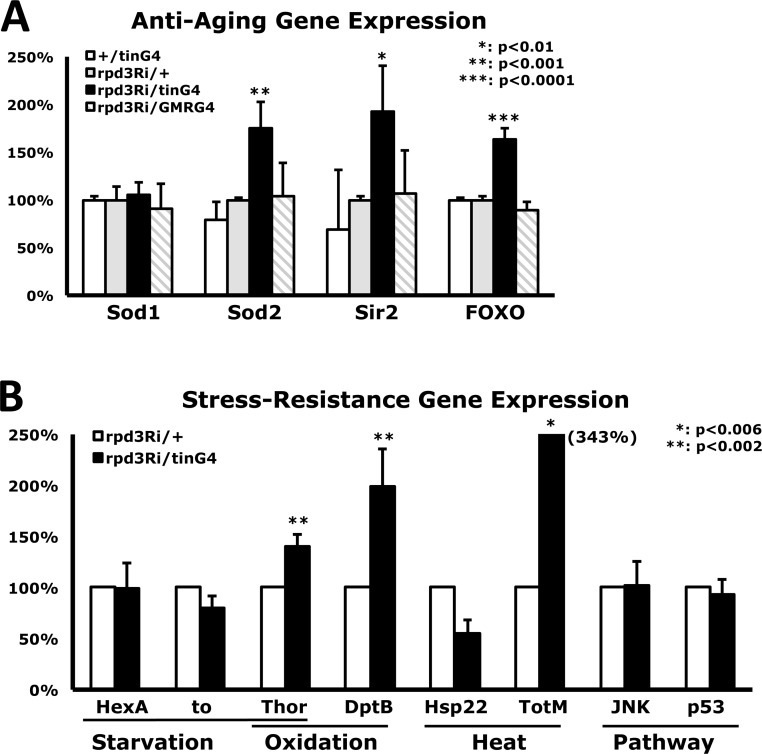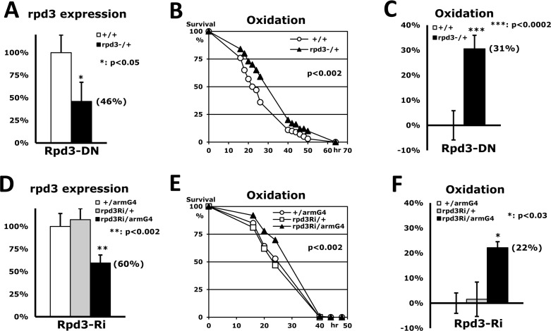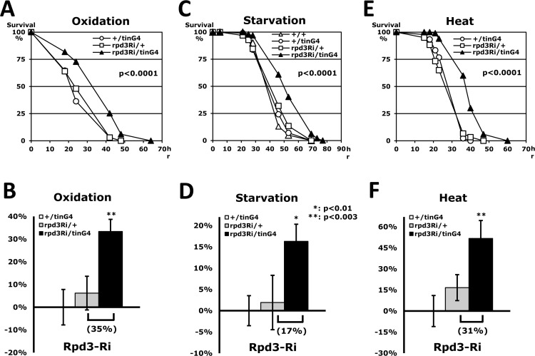 As a histone deacetylase (HDAC), Rpd3 modulates chromatin structures, including the heterochromatin of Drosophila telomeres, by interacting with several chromatin remodeling complexes [1]. The Rpd3 protein is also reported to mediate epigenetic effects like long-term memory and lifespan. Overexpression or RNAi-mediated knockdown of Rpd3 in the adult fly brain results in impaired long-term courtship memory [2]. However, systemic Rpd3 downregulation extends lifespan in rpd3−/+ heterozygous mutants [3] although rpd3−/− homozygotes are lethal. This longer lifespan is also detected in yeast with Rpd3 downregulation [4]. Consistently, feeding Drosophila 4-phenylbutyrate (PBA, an inhibitor of histone deacetylase) throughout adulthood could significantly increase lifespan [5]. Several long-lived mutant flies have displayed increased resistance to numerous stressors including oxidation, starvation and heat over wild-type flies, indicating a positive correlation between stress resistance and lifespan extension [6-9]. Downregulation of Rpd3 has been known to extend lifespan in Drosophila [3], however its relationship to stress resistance has not yet been characterized.