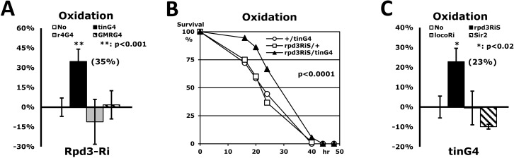 To exclude a possibility of non-specific RNA interference from 482bp target sequences of rpd3Ri transgene, the specific 21bp of another region in the rpd3 gene was tested as a new heart-specific dsRNAi (rpd3RiS/tinG4 in Fig. 3B). Although the 23% increase in stress resistance of the rpd3RiS/tinG4 flies (Figs. 3B-C) was less than the 35% increase of the rpd3Ri/tinG4 flies (Fig. 3A), it confirmed that dsRNAi of any region of the rpd3 gene in the heart enhances the stress resistance systemically (Fig. 3). We also tested whether other long-lived flies can enhance heart-specific stress resistance (Fig. 3C). It has previously been found that the Loco downregulation throughout the entire body increases not only the resistance to three stressors, including oxidation (26-63% increase), but also extends lifespan (17-32% extension) [17]. However, Loco downregulation limited exclusively to the heart (locoRi/tinG4) had no effect on oxidative stress resistance (−0.5% in Fig. 3C), suggesting that the rpd3 gene is specific for heart-specific stress resistance. Sir2, another histone deacetylase, was also investigated in a heart-specific manner. It was reported that the Sir2 upregulation extends lifespan in flies, but is dependent upon the Sir2 dosage [25]. Stress resistance, however, was not enhanced by either mild or high Sir2 upregulation in the heart (Sir2/tinG4 in Fig. 3C), implying that the Rpd3's deacetylase activity is directly related to the stress resistance mechanism within the heart tissue. Although the fat body-specific dFOXO upregulation increases stress resistance and lifespan in flies [23, 24], a heart-specific dFOXO upregulation could not be tested in stress resistance due to semi-lethality in our genetic background (data not shown), further implicating that the heart-specific Rpd3 exclusively contributes to the enhanced stress resistance.