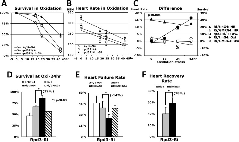 In contrast, Rpd3 downregulation within other non-cardiac tissues had no observable impact in either stress resistance or heart function (Figs. 3A and 5C). For example, Rpd3 downregulation in the eye, Rpd3Ri/GMRG4, did not display an increase of survival in the oxidative stress over the Rpd3Ri/ + control during whole time period stressed (Fig. 5C). After 24 hours, the controlled +/GMRG4 and Rpd3Ri/+ cohorts had survival rates of 19% and 65% respectively, yet only 58% of the rpd3Ri/GMRG4 had survived (SFig. 4A). Corroborating this assertion, heart rate was also reflective of being in between both controls; at 24 hours there was a 12% increase in heart rate over the +/GMRG4 genotype, but a 4% decrease over the Rpd3Ri/+ genotype (SFig. 4B). Finally, we compared the differences between heart-specific and eye-specific Rpd3 downregulation through the common control genotype, Rpd3Ri/+ (Fig. 5C). During the oxidative stress, the comparison showed that heart-specific Rpd3 downregulation provides an average enhancement of 13% in cardiac activity, with a gradual increase in oxidative stress resistance up to a maximum 33%. In contrast, eye-specific Rpd3 downregulation averaged only −0.1% and −1.3% changes, respectively (Fig. 5C).