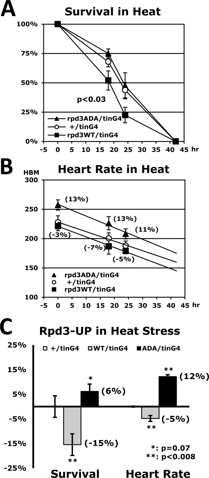 Our findings, which the heart-specific Rpd3 downregulation enhances stress tolerance and cardiac function, let us investigate whether rpd3 upregulation in the heart causes the opposite effect. Using a UAS-rpd3WT transgene (Fig. 6A) the stress tolerance was measured under the heat stressor. The heart-specific Rpd3WT upregulation (rpd3WT/tinG4), unsurprisingly, revealed a 15% decrease of the median survival time (hour) in resistance against the heat (Figs. 6A and C) when compared to the control (+/tinG4). Similarly, the heart rate in cardiac function was also reduced by an average of 5% in the different time points of a heat-stressed period (Figs. 6B-C). All assays were statistically significant (P < 0.007), which indicate that the heart-specific Rpd3 upregulation decreases both stress resistance and cardiac function.