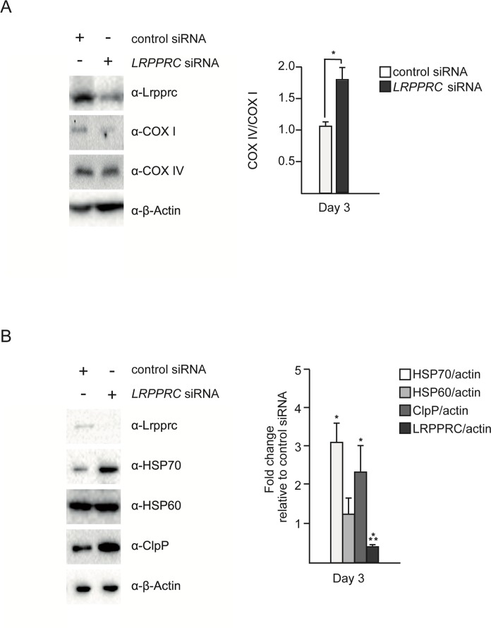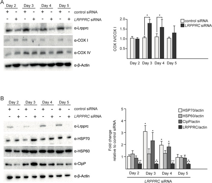 In order to test the effect of the induction of UPRmt upon LRPPRC siRNA on the balance between nuclear- and mitochondria-encoded complex IV subunits, we performed a time course experiment. The imbalance between COX I and COX IV is first observed after 3 days of LRPPRC siRNA (Figure 2A). This time point also corresponds to the highest level of induction of HSP70 and ClpP (Figure 2B). After 5 days of LRPPRC siRNA, the level of COX IV protein decreases (down to 50% of the level in control siRNA cells), restoring the balance between COX I and COX IV subunits (Figure 2A). This time point coincides with a decrease of the levels of HSP70 and ClpP back to the levels measured in control cells (Figure 2B). A similar transient activation of UPRmt was observed in HEK293T cells (Figure S1). Therefore, the transient activation of UPRmt correlates with the restoration of mitochondrial proteostasis in the context of LRPPRC siRNA.