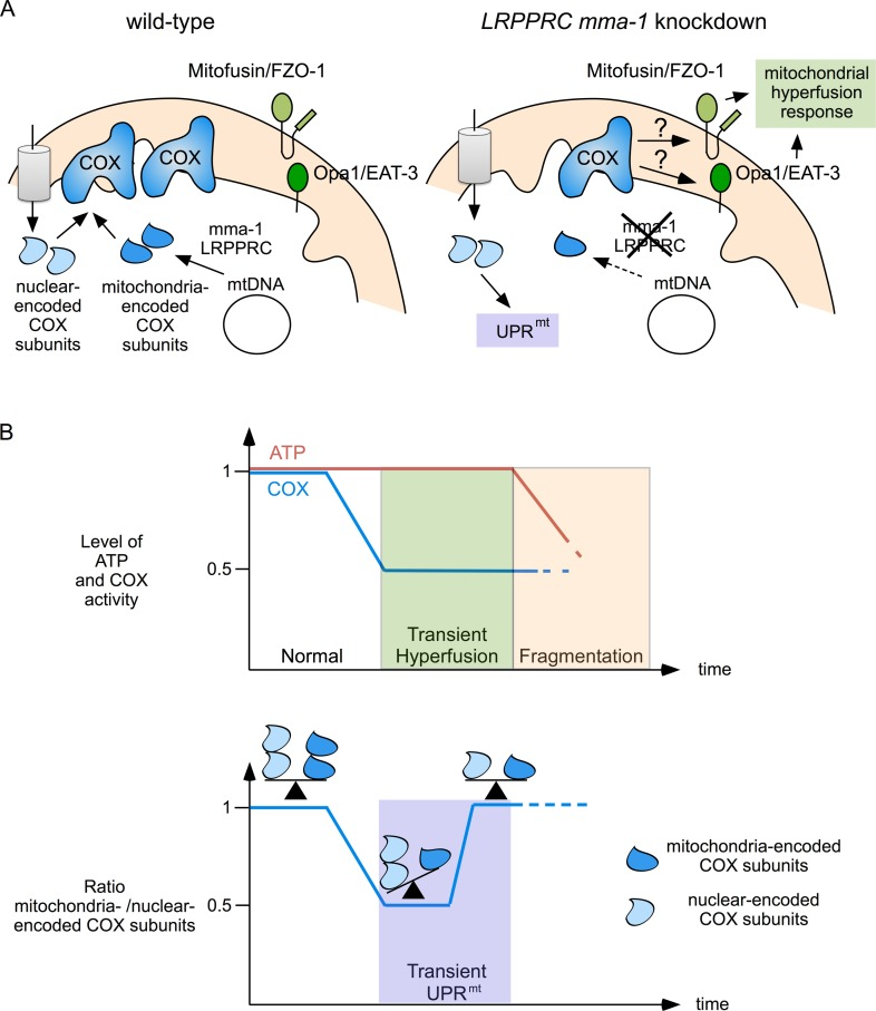 Whereas UPRmt and mitochondrial hyperfusion in response to LRPPRC mma-1 RNAi follow similar kinetics, genetic experiments in C. elegans indicate that the pathways that mediate these two responses are distinct. Specifically, LRPPRC mma-1 RNAi-induced UPRmt is dependent on the previously described HAF-1, ATFS-1 pathway, whereas LRPPRC mma-1 RNAi-induced mitochondrial hyperfusion is not. This notion is furthermore supported by the fact that in C. elegans, a mild depletion of MMA-1 protein activates only the UPRmt pathway whereas a strong depletion of MMA-1 activates both pathways. The pathway through which a reduction in LRPPRC mma-1 function induces mitochondrial hyperfusion remains to be elucidated. Similarly, the mechanism through which mitochondrial hyperfusion and UPRmt are coordinated is currently unknown.