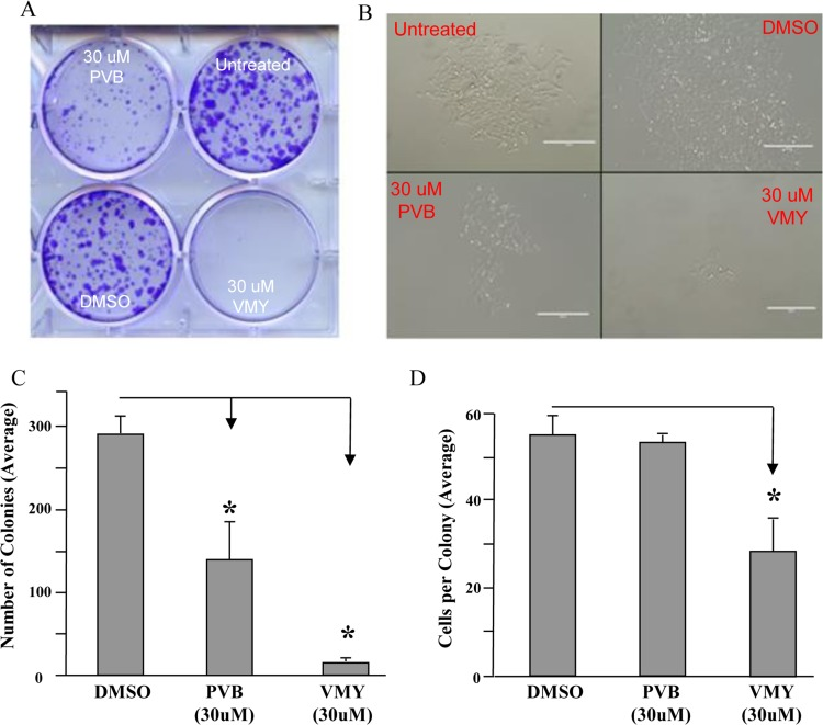 Figure 1. VMY induced cell death The durability of effects of VMY on cell viability was determined via colony forming assays. D556 cells were treated with DMSO, PVB or VMY for 18 hrs. Fresh media was added and the cells cultured for an additional 3-5 days. (A) Cells stained with crystal violet. (B) Colonies as visualized by microscopy. (C) Quantification of colony number. (D) Quantification of cells per colony. The data are shown as average + standard deviation. PVB; purvalanol B, *; p<0.05.