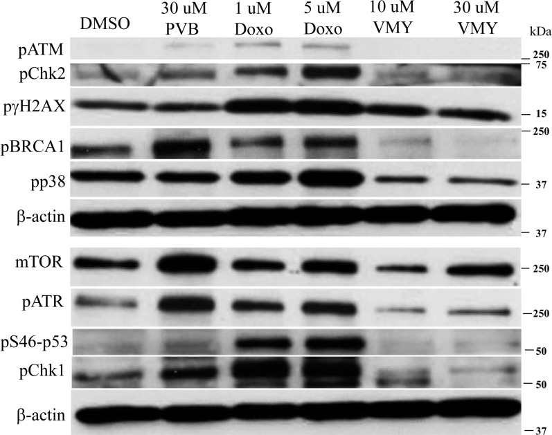Figure 2. Effects of VMY on stress related proteins DAOY cells were treated for 18 hrs with DMSO, PVB, VMY or doxorubicin at the concentrations listed and immunoblotting was performed for the proteins shown. β-actin was used as a loading control. PVB; purvalanol B, Doxo; doxorubicin.
