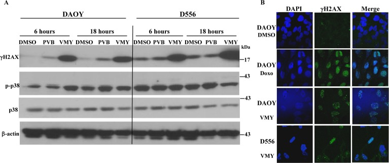 Figure 3. Effects of VMY on stress related proteins in MB cells DAOY and D556 cells were treated with PVB or VMY. (A) Immunoblotting was performed for total and phosphorylated p38 and phosphorylated γ-H2AX following treatment for 6 or 18 hrs. (B) Immunofluorescence microscopy for γ-H2AX was performed on DAOY cells treated with 1 uM doxorubicin for 18 hrs and DAOY and D556 cells treated with 10 uM VMY for 18 hrs. DAPI was used to stain the nuclei. PVB; purvalanol B, Doxo; doxorubicin.
