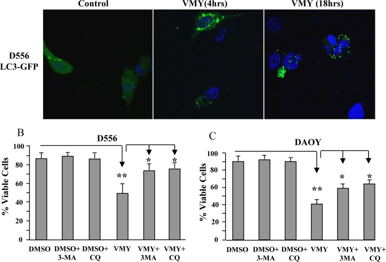 Figure 4. Induction of Autophagy by VMY reduces cell viability (A) D556 cells, transfected with LC3-GFP, were treated with DMSO or VMY for 4 and 18 hrs. Autophagic LC3-GFP puncta were visualized by fluorescence microscopy. Cell nuclei were stained with DAPI. (B) D556 and (C) DAOY cells were treated with VMY for 18hrs in the presence or absence of 5 uM 3-MA (an inhibitor of early autophagy) or 50 uM chloroquine (an inhibitor of acidification of lysosomes and autophagosomes), and trypan blue viability assays were performed to establish cell viability. The data are shown as the average + standard deviation of N=3 separate experiments. *; p<0.05, **; p<0.01, 3-MA; 3-methyladenine, CQ; chloroquine.