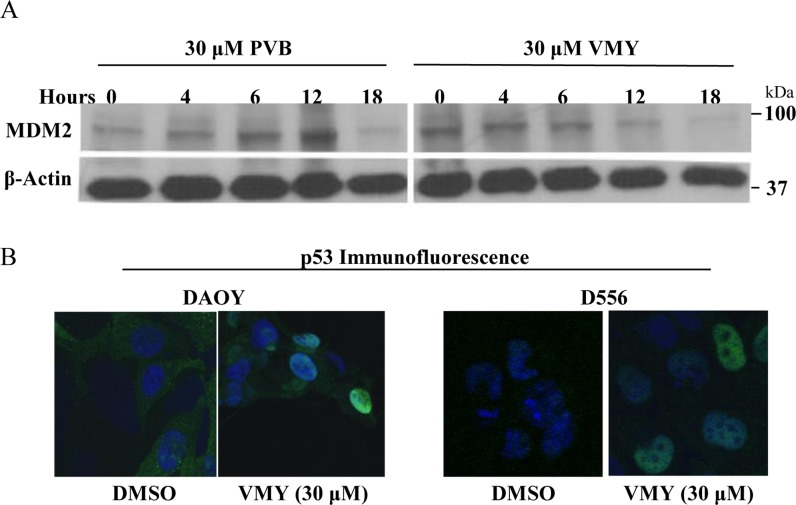 Figure 5. VMY alters the subcellular localization of p53 (A) Immunoblotting for MDM2 following exposure of D556 cells to PVB and VMY for the times indicated. β-actin was used as a loading control. (B) Immunofluorescence microscopy for p53 subcelluar localization was performed on DAOY (left panels) and D556 (right panels). DAPI was used to stain the nuclei. PVB; purvalanol B.