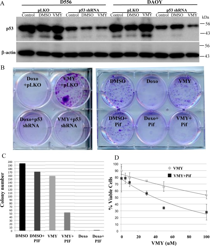Figure 6. Effects of silencing of p53 on cell survival (A) Genetic silencing of p53. D556 and DAOY cells were infected with p53siRNA or pLKO lentivirus'. The cells were left untreated or exposed for 18 hrs to DMSO or 30uM VMY as indicated, and western blots for p53 and β-actin were run. (B) The effects of p53shRNA knockdown (left) and Pifithrin (Pif, right) on cell viability were determined via colony forming assays. D556 cells were treated with DMSO, doxorubicin or VMY for 18 hrs. Fresh media was added and the cells cultured for an addition 3-5 days, followed by staining with crystal violet. (C) Quantification of the number of colonies in (B). (D) Dose response curves of D556 cells treated with VMY at the concentrations shown in the presence and absence of Pifithrin. The data are shown as average + standard deviation of N=3 separate experiments.