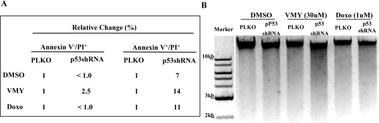 Figure 7. Effects of p53 knockdown on apoptosis and DNA fragmentation in D556 cells (A) The proportion of cells undergoing apoptotic cell death as a result of p53 shRNA knockdown in D556 cells treated for 18 hrs with DMSO, VMY (30uM) or doxorubicin (1uM) as assessed using annexin V and propidium iodide (PI) staining and measured by flow cytometry. Data are shown as percent change in staining versus pLKO-control infected cells. (B) D556 cells were infected with pLKO or p53shRNA and treated with DMSO, VMY or doxorubicin for 18hrs. DNA fragmentation of nuclear DNA was assessed by ethidium bromide-agarose gel electrophoresis.