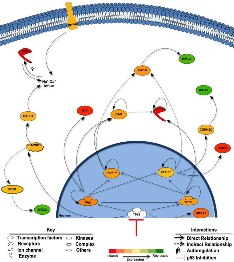 Figure 8. Proposed mechanisms of enhanced cell death following inhibition of p53 Shown are the effects of p53 suppression on components of cell death pathways in Pif + VMY vs. VMY treated D556 cells. p53 inhibition by Pifithrin resulted in the induction of p63 and p73 genes and subsequent enhanced cell death via apoptosis. Induction of the p63 and p73 genes leads to the activation of p211 and p27KIP1 both of which can indirectly trigger FADD, reducing the expression of BIRC3 (cIAP2). Induction of p73 led to large increases in EndoG and CIDEB expression leading to DNA fragmentation while increased levels of p63 induced apoptosis though BIRC3 and BIK, the latter of which along with TRPM8 can influence intracellular calcium levels. BAD; BCL2-Associated Agonist Of Cell Death, BIK; BCL2-Interacting Killer (Apoptosis-Inducing), BIRC3; baculoviral IAP repeat containing 3 (cIAP2), BRAT1; BRCA1-Associated ATM Activator 1, CAPN; Calpain, CALB1; Calbindin 1, CDKN2D; Cyclin-Dependent Kinase Inhibitor 2D (p19Ink4D), CIDEB; Cell Death-Inducing DFFA-Like Effector B, EndoG; Endonuclease G, FADD; Fas-Associated Via Death Domain, INCA1; Inhibitor Of CDK, Cyclin A1 Interacting Protein 1, NF-KappaB; Nuclear Factor Of Kappa Light Polypeptide Gene Enhancer In B-Cells, TRPM8, Transient receptor potential cation channel subfamily M member 8.