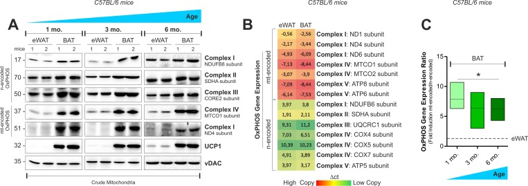 RT-qPCR analysis was carried out as previously described [4]. To calculate OxPHOS gene expression ratio, nuclear-encoded OxPHOS mRNA levels were compared to mitochondrial-encoded OxPHOS mRNA. The relative mRNA levels were determined by using the 2-ΔΔCt method and were normalized to β-actin. ΔCt values were used to generate Heat Map by Excel software.