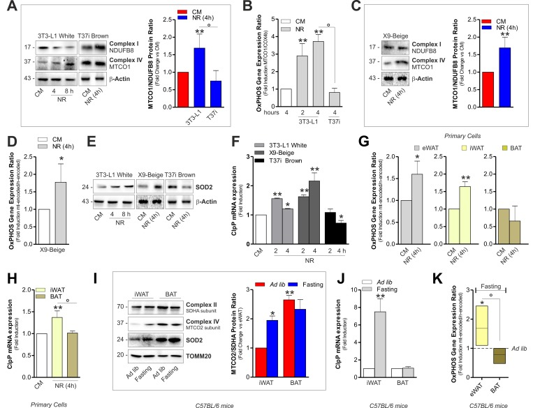 Accordingly, in BAT crude mitochondria from 1, 3 and 6 months old mice, we observed higher OxPHOS protein levels than epididymal WAT (eWAT) (Fig. 1A and Fig. S1A). In order to compare the transcriptional level of mitochondrial mtDNA- and nuclear nDNA-encoded OxPHOS genes in white and brown adipose depots, we performed an OxPHOS gene expression array. As showed in Fig. 1B and S1B, both eWAT and BAT revealed higher expression of mtDNA- than mtDNA-encoded OxPHOS mRNA. However, the transcriptional efficiency of BAT (Fig. 1C and Fig. S1C) and T37i brown adipocytes (Fig. S1D) was mainly shifted toward mtDNA-encoded OxPHOS genes. Given that mitonuclear imbalance is involved in the adaptive response to metabolic requirements [18-19], we analyzed whether it could occur in adipocytes upon nutrient restriction (NR). As showed in Fig. 2A and Fig. S1E, NR leads to mitonucle ar protein imbalance in 3T3-L1 adipocytes, as evidenced by the increased ratio between the mtDNA-and the nDNA-encoded OxPHOS proteins. We also revealed a significant increase in the mRNA ratios between mtDNA-encoded MTCO1 and nDNA-encoded COX4b (Fig. 2B). The analyses of other OxPHOS gene expression ratios revealed the same trend (Fig. S1F). The results obtained by the calculation of the OxPHOS gene expression ratio revealed increased mitochondrial transcription efficiency in white adipose depots (Fig. S1G). Conversely, T37i adipocytes had not increased ratios between MTCO1 and nDNA-encoded NDUFB8 proteins (Fig. 2A) as well as MTCO1 and Cox4b mRNAs (Fig. 2B). Furthermore, also beige adipose cells up-regulated the ratio between mtDNA-and nDNA-encoded proteins and mRNAs after NR (Fig. 2C and 2D). The disturbance of the delicate mitonuclear balance triggers the induction of nDNA-encoded mitochondrial stress factors such as antioxidant enzyme SOD2 and protease ClpP [16, 20]. As expected, we found that NR increased SOD2 and ClpP levels in 3T3-L1 and X9 but not in T37i adipocytes, where on the contrary SOD2 and ClpP levels were diminished (Fig. 2E and 2F). Similarly to immortalized adipocytes, primary adipocytes displayed an increased ratio between mtDNA-and nDNA-encoded genes (Fig 2G) as well as increased ClpP mRNA levels (Fig 2H). Primary adipocytes derived from BAT did not show this trend (Fig 2G and 2H). Finally, we investigated the mitochondrial adaptive response in adipose tissues of 20 h fasted mice. An increased ratio between mtDNA-encoded MTCO2 and nDNA-encoded SDHA proteins as well as an accumulation of SOD2 (Fig 2I) and ClpP (Fig 2J) was disclosed in iWAT but not in BAT crude mitochondrial fractions. Expectedly, 20 h fasting led to an increased mRNA ratio between mtDNA-and nDNA-encoded OxPHOS genes in eWAT (Fig 2K) with respect to ad libitum fed mice.