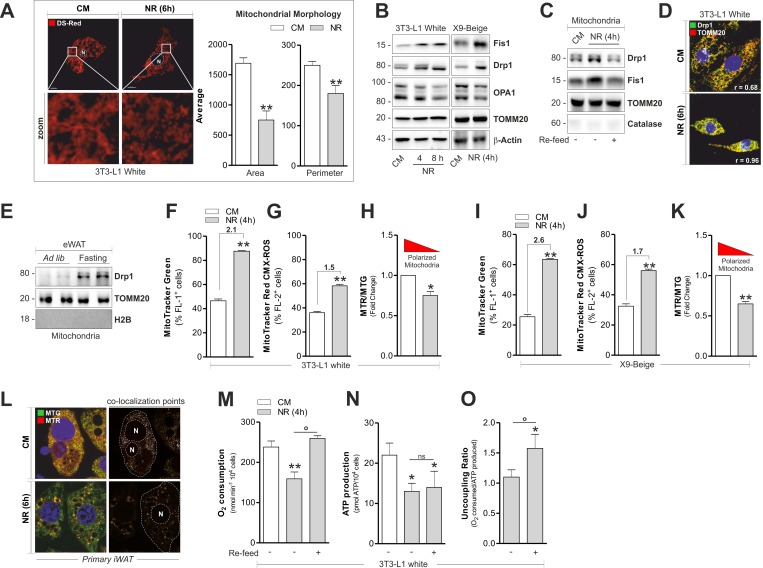 Mitochondria undergo continuous cycles of selective fusion and fission, and nutrients as well as hormones efficiently affect these processes [21]. Although NR increases oxidative metabolism in white adipocytes [4], its effect on adipocyte mitochondrial dynamic is still unknown. Through morphometric analysis of confocal microscopy images we observed that mitochondria of 3T3-L1 adipocytes appeared higher in number but smaller in per imeter and area, implying the occurrence of mitochondrial fragmentation (Fig 3A). In line with this hypothesis, 3T3-L1 adipocytes accumulated Drp1 and Fis1 in total protein extracts (Fig 3B) as well as in crude mitochondrial fractions (Fig 3C), while the canonical marker of mitochondrial fusion OPA1 underwent a progressive reduction (Fig 3B). The mitochondrial dynamic observed in 3T3-L1 cells was not accompanied by variations in total levels of the mitochondrial protein translocase TOMM20 (Fig 3B). Nutrient refill with complete medium (CM) was able to restore the basal level of Drp1 and Fis1 localized at mitochondrial level in 3T3-L1 adipocytes (Fig 3C). Differently, no significant changes in mitochondrial fragmentation markers were detected in T37i adipocytes subjected to NR (Fig S1H). By confocal microscopy analysis we revealed a higher co-localization degree (Pearson coefficient, r = 0.96) between Drp1 and TOMM20 in 3T3-L1 adipocytes upon NR (Fig 3D) and increased mitochondrial fission was also observed in starved X9 adipocytes (Fig 3B). These results were recapitulated in crude mitochondria isolated from 20 h fasted mice in which we detected an increased level of Drp1 in eWAT mitochondria (Fig 3E). Next we quantified mitochondrial amount and membrane potential (ΔΨM) by staining 3T3-L1 and X9 adipocytes with MitoTracker Green (MTG) and MitoTracker Red (MTR), respectively. Interestingly, NR increased the degree of MTG positive 3T3-L1 (Fig 3F) and X9 adipocytes (Fig 3I). An increase of ΔΨM was evidenced, although at lesser extent with respect to mitochondrial number (Fig 3G and 3J). Such ΔΨM increase was apparent, as established by normalizing MTR fluorescence (sensitive both ΔΨM and mitochondrial number) with MTG value, which is sensitive only to mitochondrial number. In particular, as reported in Fig 3H and 3K, the calculation of Red-to-Green ratio (MTR/MTG) evidenced that starved adipocytes undergo mitochondrial depolarization. The same results were obtained by staining mitochondria with the cardiolipin fluorescent probe nonyl acridine orange (indicative of mitochondrial number) and tetramethyl rhodamine (sensitive to ΔΨM) (Fig S2A). In line with these data, primary beige adipocytes displayed a reduction in co-localization points between MTG and MTR after NR (Fig 3L). Mitochondrial changes were also accompanied by a diminished O2 consumption along with a drop of ATP level in 3T3-L1 white adipocytes (Fig 3M and 3N). To verify whether such variations were due to the deprivation of nutrients, we refill cells with CM. Under this condition, we found restoration of O2 consumption without a concomitant recovery of ATP (Fig 3M and 3N), suggesting the occurrence of an uncoupling process (Fig 3O), accompanied by improved OxPHOS machinery (Fig 2).