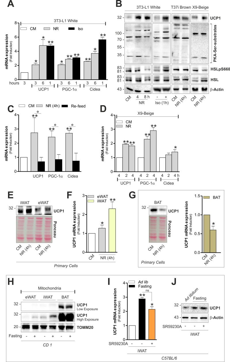 Augmented mitochondrial fragmentation and uncoupling have been identified as key features that accompany the browning process [22]. As reported in Fig 4A, the expression of brown fat-related markers were increased in 3T3-L1 adipocytes upon NR to levels comparable to those reached upon treatment with the β-adrenoreceptor agonist isoproterenol. Concomitantly, UCP1 protein levels increased both during NR and isoproterenol treatment (Fig 4B). Furthermore, the newly synthetized UCP1 resulted localized into mitochondria (Fig S2B). To more specifically link the development of a brown-like phenotype to NR, we cultured starved 3T3-L1 adipocytes with CM (re-feed). As demonstrated in Fig 4C, nutrient refill was effective in reverting the up-regulation of PGC-1α, UCP1 and Cidea. In accordance with the above-described data, X9 adipocytes quickly responded to NR by up-regulating (Fig 4E and 4F). Conversely, we revealed a down-brown-related markers (Fig 4B and 4D). UCP1 was regulation of UCP1 level both in immortalized T37i also induced in primary beige and white adipocytes (Fig 4B) and primary brown adipocytes (Fig 4G).
