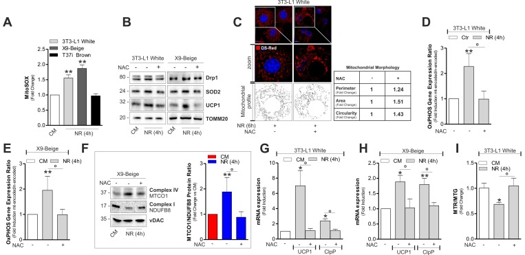 Mitochondrial ROS (mtROS) production appears to be a tightly regulated process that is essential for tuning the magnitude or effectiveness of the mitochondrial adaptive response [23]. NR is able to impinge mtROS that are key mediators of the signal transduction pathway culminating in the metabolic adaptation of 3T3-L1 adipocytes [4]. Similarly to 3T3-L1, we found an increased mtROS production also in X9 cells, while T37i adipocytes were unresponsive (Fig 5A). Interestingly, the lack of oxidative phenomena in brown adipocytes observed after mtROS-generating treatments (i.e. fasting) could be linked to basal higher mitochondria antioxidant defensive proteins (SOD2 and UCP1) in BAT with respect to WAT (Fig S3B). Successively, to dissect the role of mtROS in orchestrating mitochondrial stress response, we treated 3T3-L1 and X9 adipocytes with the antioxidant N-acetyl cysteine (NAC) prior to NR. As expected, NAC was able to prevent mtROS production both in 3T3-L1 and X9 adipocytes (Fig S3C) and it was effective in limiting SOD2 and UCP1 proteins up-regulation (Fig 5B). These results were recapitulated by overexpressing SOD2 [SOD2(+)] in 3T3-L1 adipocytes (Fig S3D). Furthermore, antioxidant-boosting strategies (NAC treatment or SOD2 overexpression) were also effective in limiting Drp1 induction (Fig 5B and S3D) and mitochondrial fragmentation (Fig 5C). Our data describe the ability of mtROS also in governing mitochondrial adaptive responses to NR in white and beige adipocytes. Indeed, NAC treatment prevented the alteration of the ratio between mtDNA-and nDNA-encoded imbalance both in 3T3-L1 (Fig 5D) and X9 (Fig 5E and 5F) adipose cells. NAC was also able to prevent UCP1 and ClpP mRNA elevation in 3T3-L1 (Fig 5G) and X9 adipocytes (Fig 5H). Mitochondrial depolarization in 3T3-L1 adipocytes was also dampened (Fig 5I) in line with unchanged UCP1 levels.