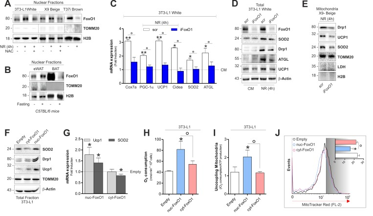 To finally implicate nuclear redistribution of FoxO1 in the uncoupling adaptive response of white adipocytes, we transfected 3T3-L1 adipocytes with a form of FoxO1 that is retained within the cytoplasm (cyt-FoxO1, GFP-tagged) or with a constitutively active form of FoxO1 (Myc-tagged) that is specifically localized within nuclei (nuc-FoxO1) (Fig S4D). Western blot analysis indicated that 3T3-L1 cells overexpressing nuc-FoxO1 up-regulate brown-related mitochondrial markers such as UCP1, Drp1 and SOD2 proteins (Fig 6F and Fig 6G). In line with the enhancement of the mitochondrial functionality coupled with the UCP1 induction, we detected enhanced oxygen consumption (Fig 6H) and increased uncoupling ratio (Fig 6I) exclusively in adipocytes overexpressing nuc-FoxO1. Reduced ΔΨM in nuc-FoxO1 cells further corroborates the occurrence of a brown fat-like function in white adipocytes (Fig 6J).