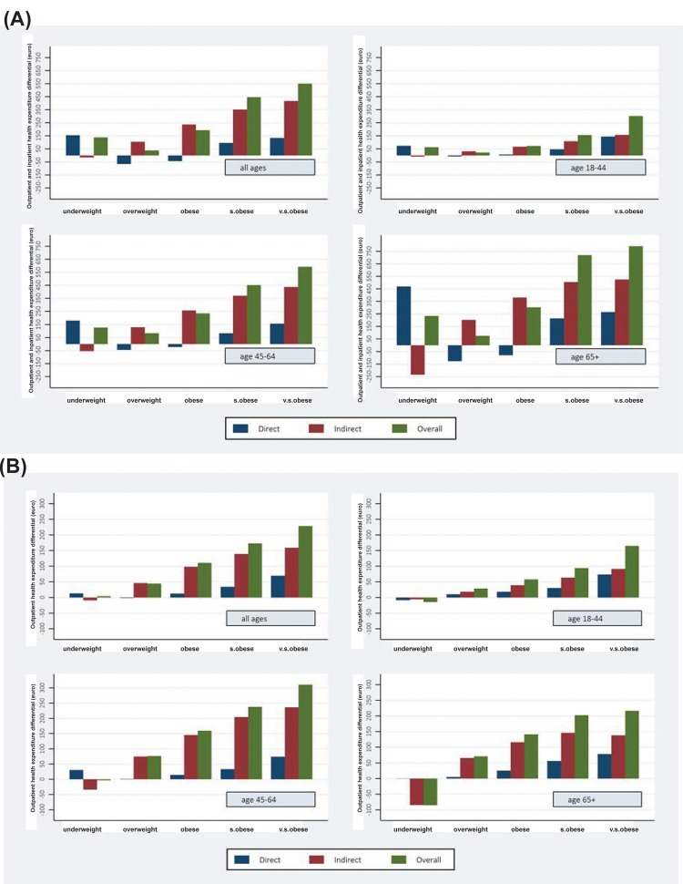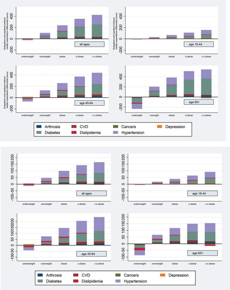 Interestingly, we found that BMI-related costs vary substantially across age groups. With respect to normoweight individuals, the highest overall (direct plus indirect) outpatient expenditure differentials in absolute terms were found in the 45-64 age group, and in the 65+ age group for total out- and in-patient health care costs. This finding suggests that outpatient health care utilization in terms of drugs, medical visits and diagnostic tests resulting from excess body weight is particularly higher in the 45-64 age group. However, when inpatient expenditure (hospitalizations) was accounted for, the 65+ age group patients generated in absolute terms the majority of the BMI related health care costs.