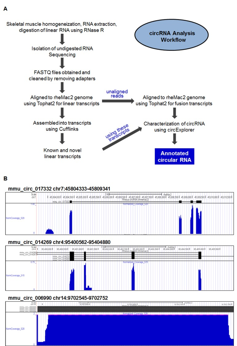 In summary, we have identified collections of circRNAs abundantly expressed in skeletal muscle tissues of Rhesus monkey. Among these, we have found subsets of circRNAs showing age-associated alterations in expression. Our results constitute a valuable resource for future studies aimed at identifying circRNAs displaying tissue-, species-, and age-dependent specificity. This report contributes to the exciting emergence of circular RNAs as versatile regulators of gene expression in biological and clinical frameworks, including muscle physiology and the age-related decline in muscle function.