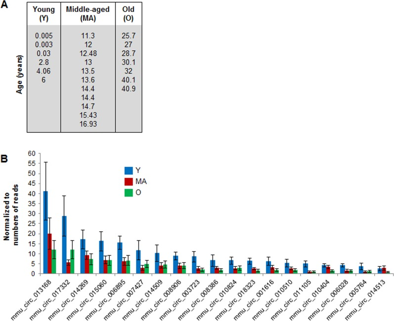 To identify specific circRNAs displaying age-related changes in abundance, we focused on circRNAs that showed > 2 reads in at least 12 samples (Supplemental Table S5). The 218 circRNAs that met this criterion (with normalized read counts between 1 and 39) were studied further to assess possible changes in circRNA abundance with age. Six monkeys spanning 0.003 to 6 years of age were considered ‘young’ (Y), 11 monkeys 11.3- to 16.9-years old were considered ‘middle aged’ (MA), and 7 animals 25.7- to 40.9-years-old were considered ‘old’ (O) (Fig. 2A). While most circRNAs were not altered among the different age groups, some 19 circRNAs were downregulated with advancing age (Fig. 2B).