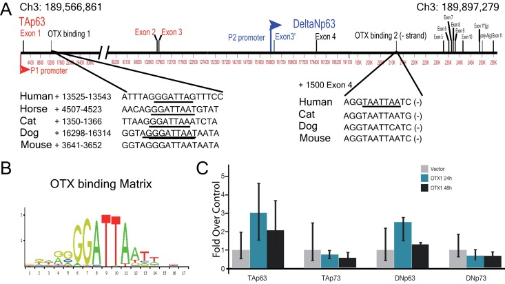 With respect to the existing data, which demonstrates the involvement of the TAp63 transcription factor in the organogenesis of the Corti organ [17], and the importance of OTX homeobox protein in the neural and sensory organs development, we analyzed the possibility of a relationship between the two transcription factors. In particular, since OTX1-2 are expressed in the early stages of embryogenesis, a downstream control of TAp63 by one of these transcription factors has been hypothesized. This analysis was first conducted “in silico”, searching for OTX responsive elements, using JASPAR matrix id PH0129.1 and PH0130.1, relative score > 0.9, represented by the motif illustrated in Fig 1B.