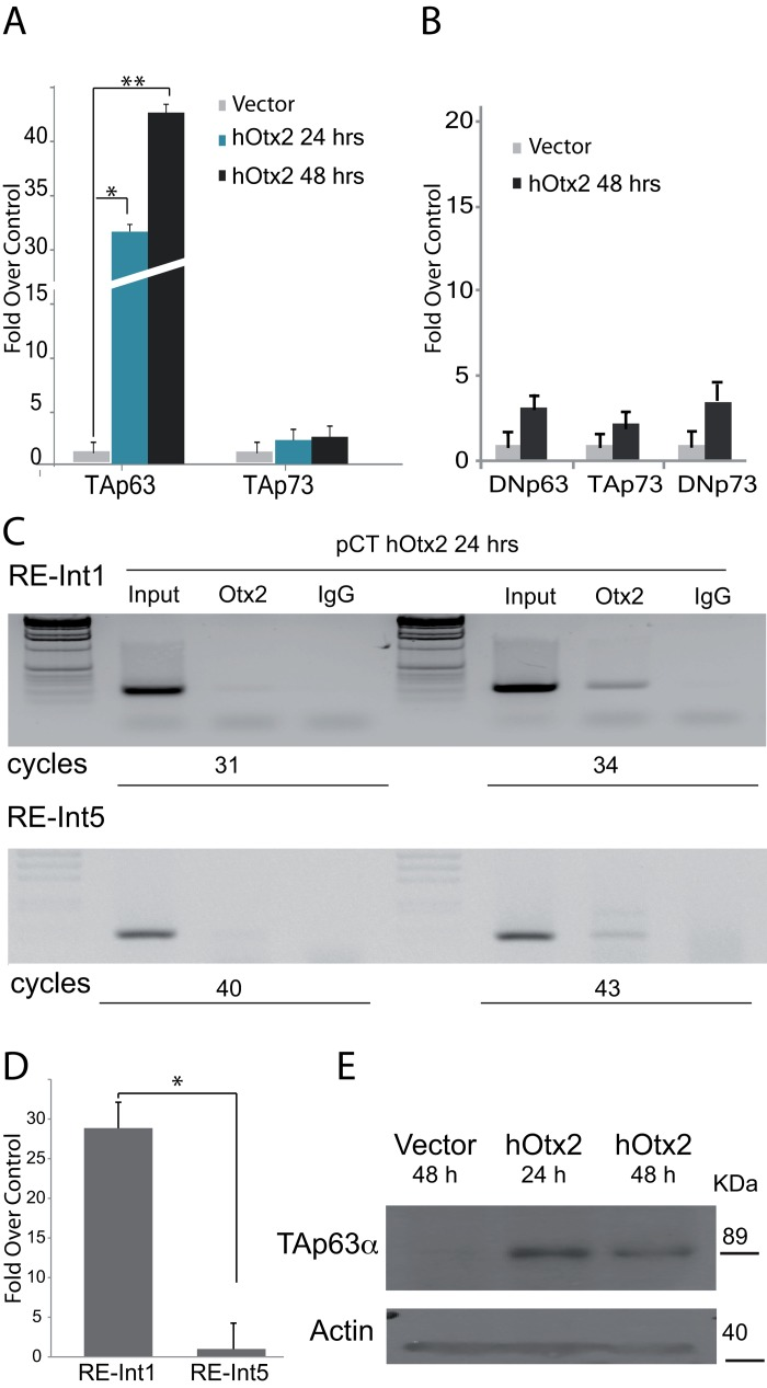 Real Time as been performed using ABII 7500 instrument, using GoTaq® qPCR Master Mix (Promega) and GoScript™ Reverse Transcription System (Promega) for reverse transcription. Primers Real Time: TAp63 (+)GGA CTG TAT CCG CAT GCA G, (−)GAG CTG GGC TGT GCG TAG; DNp63 (+)GAA GAA AGG ACA GCA GCA TTG AT, (−) GGG ACT GGT GGA CGA GGA G; TAp73 (+)CCT GGA GGG CAT GAC TAC ATC, (−)TTG TGC GTA GGG CGA GTG DNp73 (+)GGA GAT GGG AAA AGC GAA A, (−)GGA ACT GGT GTC CCG TGG. Primers ChIP: OTX2(p63int1) (+)ACA GAG CAA CAG AGG CAC TG (−) CAT GGA ATA ATT GAA GTC CCT TC; OTX2(p63int5) (+)CTG CTT GAT GTC AAC ATT TGT GGG, (−)GCA CTT TTC CTG ATG GCT CCA G.