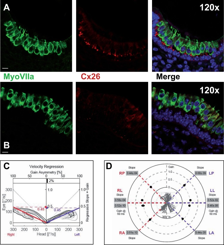 Furthermore, this phenotype could represent a predisposition to severe decline in hearing and balance due to aging, given the physiological loss of hair cells that occurs over the years. Hair cell loss may be due to several causes, most frequently oxidative stress, noise exposure and ototoxic drugs; all of these mechanisms are amplified with aging.
