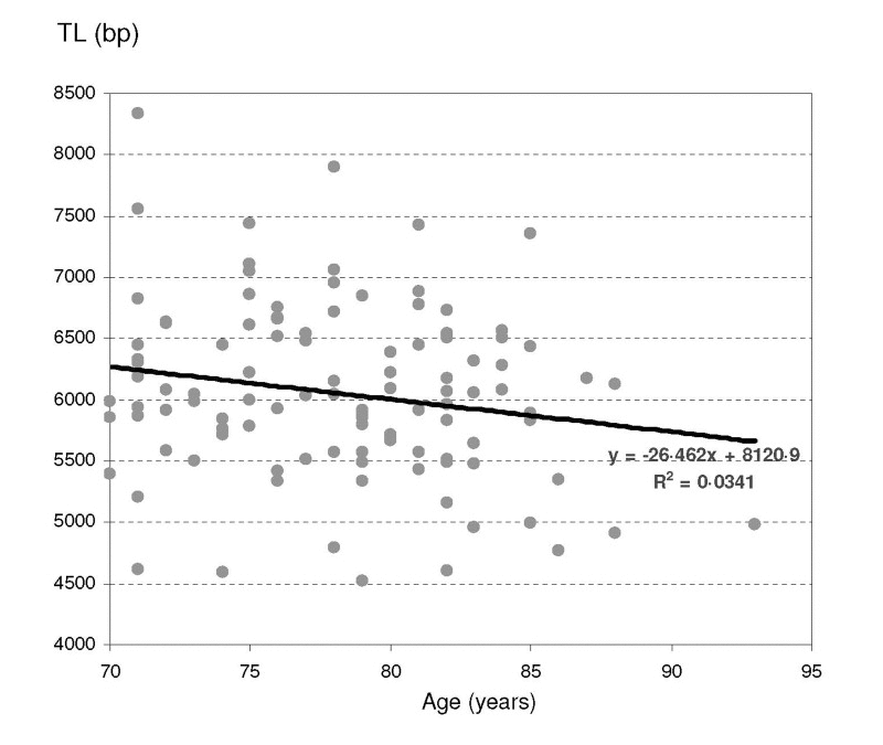 TL ranged from 4.52 to 8.33 kilobases (kb) with a mean of 6.05 kb (SD 0.71 kb). A weak inverted linear correlation with age was demonstrated, with every 1-year increase in age associated with a 26-base pair decrease in mean TL, with a R. ratio of 0.0341 (Figure 1).