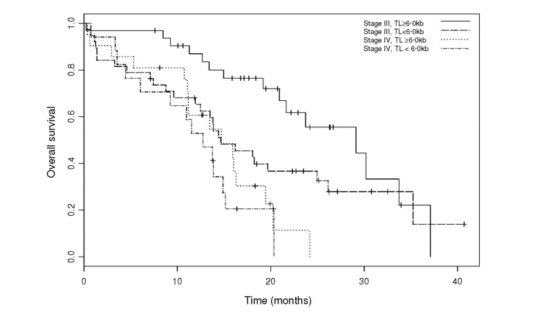 The sample size of 110 patients was calculated on the basis of the primary objective of the main part of the study (to confirm the impact of psychogeriatric covariates on OS) as reported elsewhere [12]. TL was analyzed both as a continuous ordinal variable and a categorical variable. For the former analysis, non-parametric two-sample Wilcoxon rank-sum tests were performed to evaluate the impact of TL on patient outcome. For the latter analysis, TL was transformed into quartiles, categorized into TL groups (shorter vs longer) and introduced as a dichotomous trait into linear regression models and Cox's proportional-hazards regression models. Different cut-offs were used based on the outcome under consideration. Survival curves were estimated using the Kaplan-Meier method and OS models were adjusted for FIGO stage (IV versus III). Odd ratios (ORs) and hazard ratios (HRs), 95% confidence intervals (CIs), and p values (P) were calculated. Analyses were performed using R statistical package (R Foundation for Statistical Computing, Austria) and Splus, version 6.2 (Insightful Corp., WA, USA).