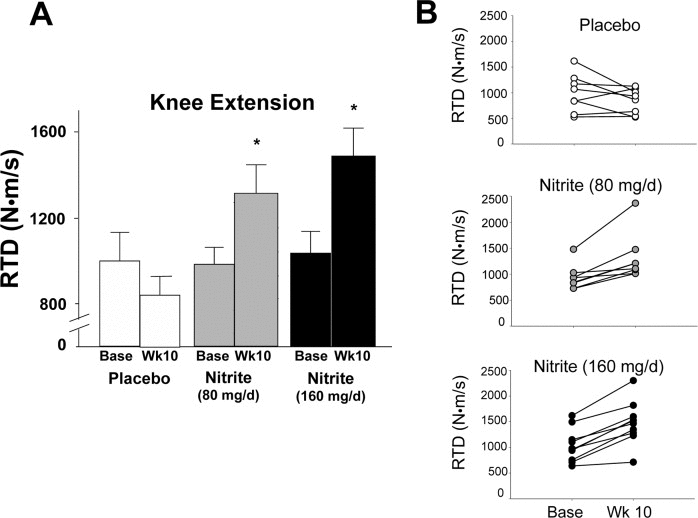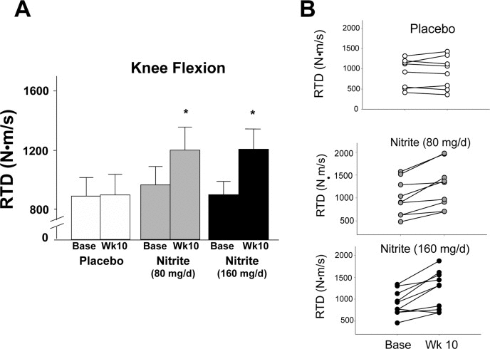 The motor outcomes demonstrating the most consistent improvements across groups (panel A) and individual participants (panel B) were knee flexor and extensor rate of torque development (RTD) (Figures 1 and 2). Specifically, knee flexor and knee extensor RTD were improved by 33 and 43% and 26 and 34%, respectively, with 80 mg/day and 160 mg/day sodium nitrite compared with placebo (p<0.01); the changes were not different between the two doses (p>0.05 between 80 and 160 mg/day). For the knee flexors, 7 of 10 individuals in the 80 mg/day group and 8 of 10 individuals in the 160 mg/day nitrite group demonstrated ≥10% improvements in RTD following sodium nitrite supplementation (Figure 1B). For the knee extensors, improvements of ≥10% were observed in 8 of 10 subjects in both the low- and high-dose groups (Figure 2B). The improvements in RTD were observed in the absence of significant changes in maximum voluntary contraction (MVC) torque for knee extensors or flexors (p>0.05, Table 3). Sodium nitrite supplementation did not alter grip strength, although a trend for improvement was observed in the 80 mg/day nitrite group (p<0.1, Table 3).