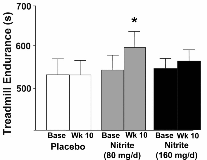 Compared with placebo, nitrite supplementation at the 80 mg/day dose improved maximal exercise capacity as assessed by treadmill time to exhaustion during the modified Balke incremental treadmill exercise protocol (Figure 3, p<0.05); no changes were observed for the 160 mg/day nitrite group. Heart rate, oxygen consumption (VO2max), ratings of perceived exertion, respiratory exchange ratio (index of hyperventilation) and minute ventilation during maximal exercise did not differ at baseline among groups nor change with nitrite supplementation (Table 4, p>0.05, all). No differences were observed at baseline among the groups or with treatment for any physiological response to submaximal levels of exercise during this treadmill protocol (data not reported).