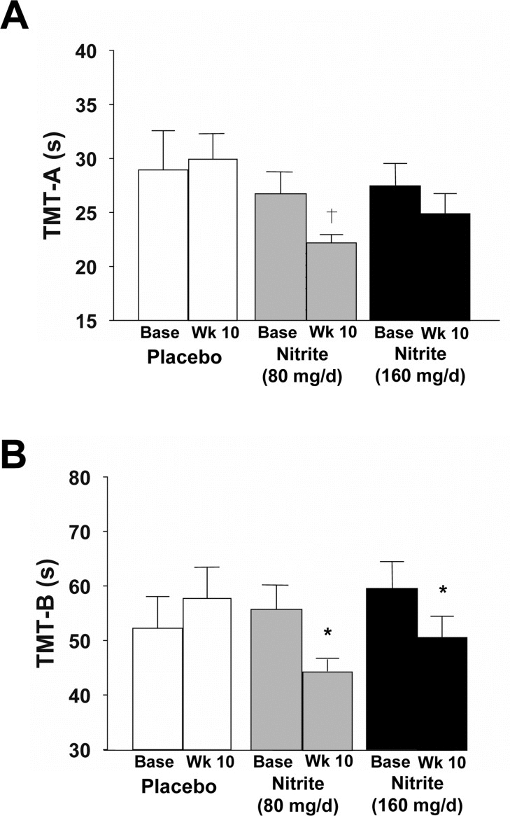 Cognitive performance was improved with 10 weeks of sodium nitrite, as indicated by reductions in time to complete the Trail Making Tests B and A (TMT-B and TMT-A) (Figure 4). Time to complete TMT-B, which is an index of executive function, was improved by 18 and 14% in response to the high- and low-doses of sodium nitrite, respectively (Figure 4A, p<0.05). Of these, 15 responded consistently for TMT-B, RTD and step errors, though one of the 5 non-responders showed a 9% improvement and was just below the 10% responder criteria. A trend was observed for an improvement in processing speed (TMT-A) in response to the 80 mg/day of sodium nitrite (14% improvement, p<0.1, Figure 4B), but not 160 mg/day. Individual performance data are shown in Supplemental Figure 1.